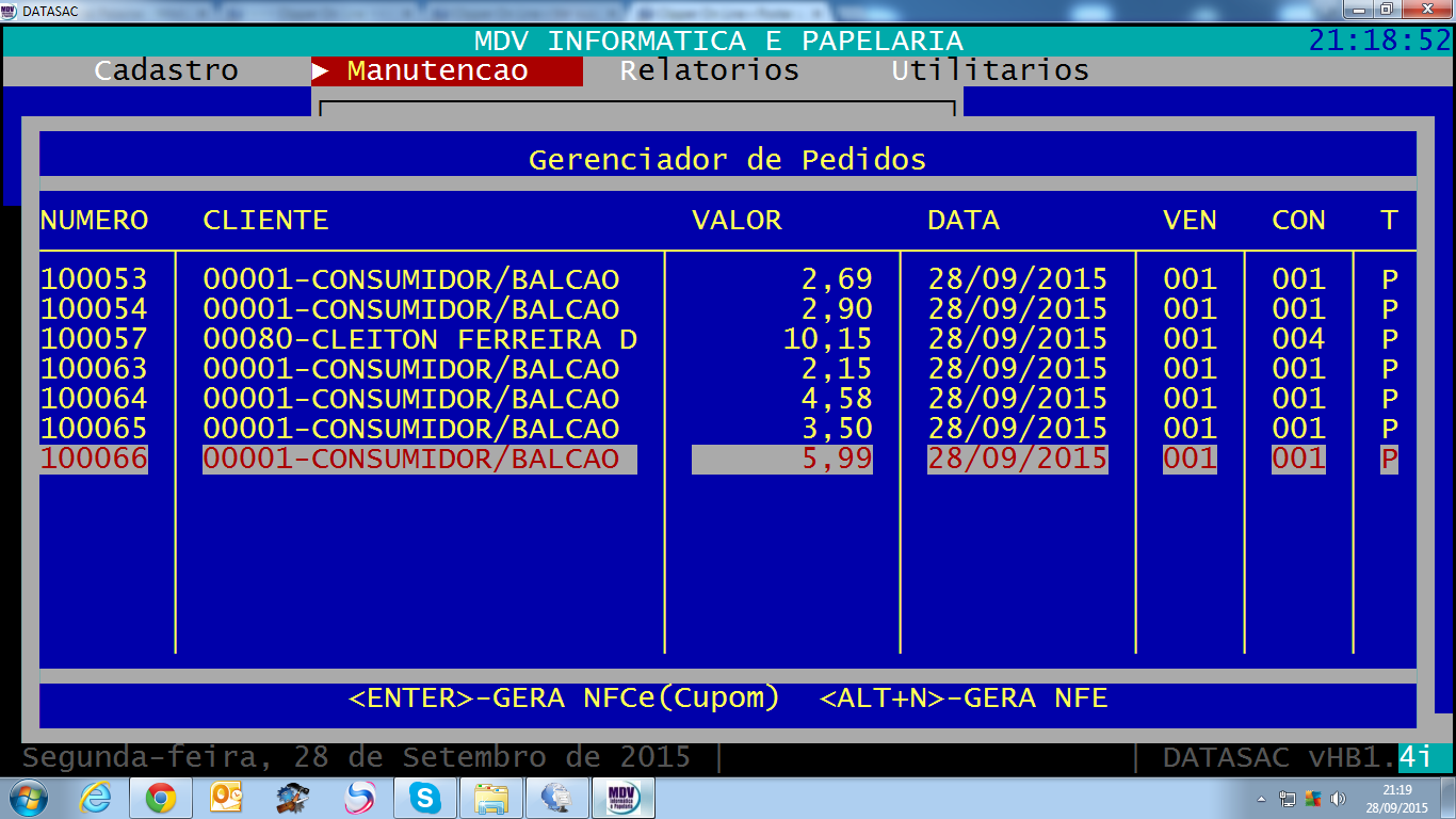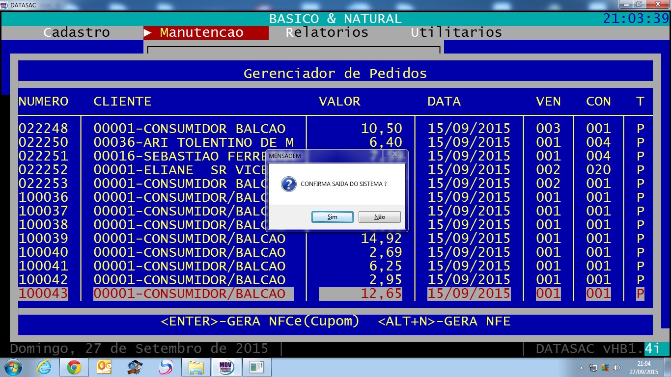 Daí se eu usar as teclas de navegação. Beleza, funciona no programa DATASAC. observe na tela abaixo que movimentei 4 linhas do tbrowse para cima. Mas se pressiona a tecla ESC assiona o MSGYESNO() perguntando se quer confirmar a saída do sistema. Mas essa msgyesno() é do programa PDV.EXE. Se eu clico com o mouse no programa DATASAC e pressiono ESC aí não aciona o msgyesno(). Dá a impressão de que está mostrando o DATASAC mas não está focando nele. Estranho que as teclas de navegação funcionam.