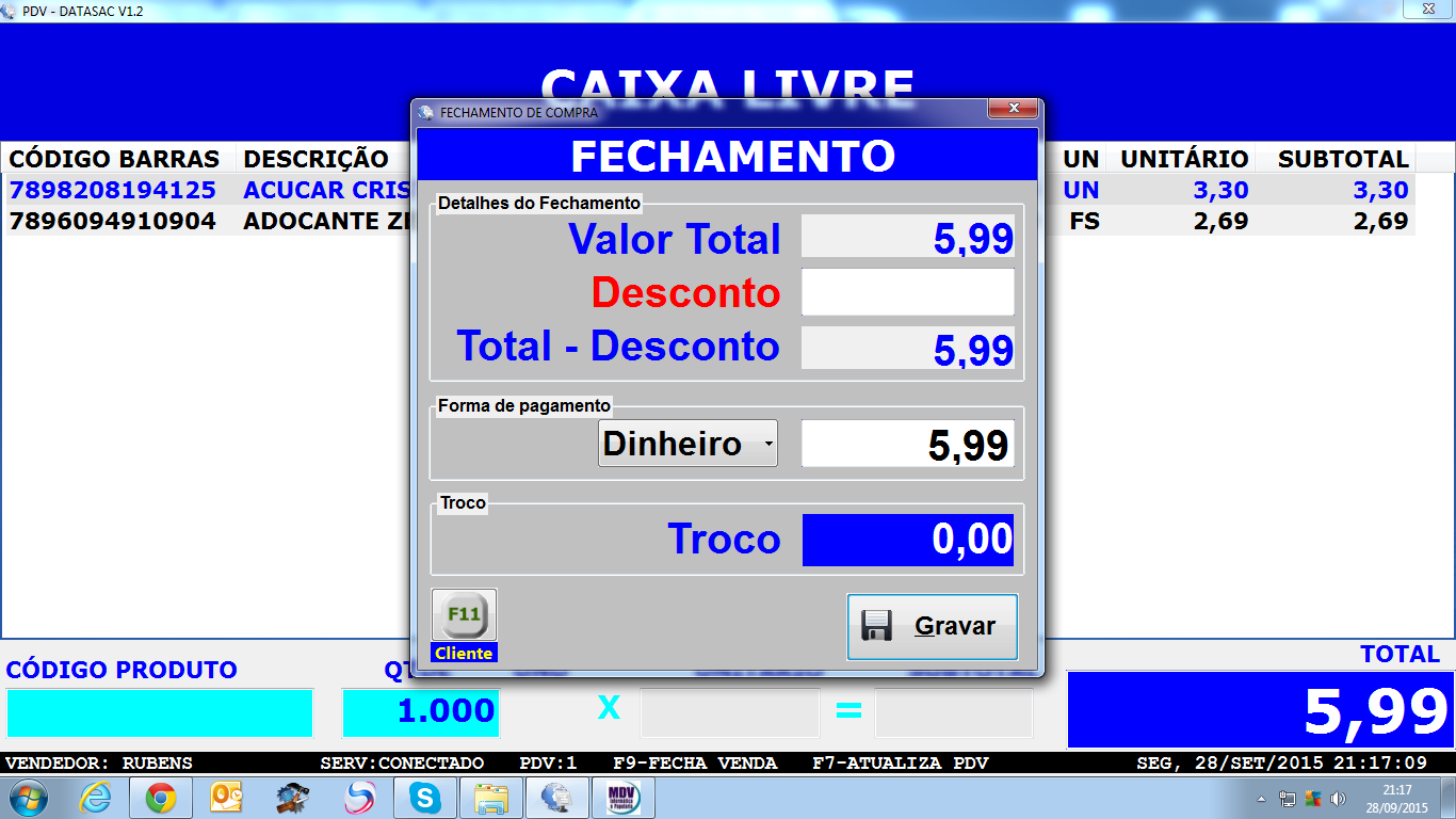 Tela do PDV. Quando grava a venda aciona o Focaliza_App( Aplicativo )