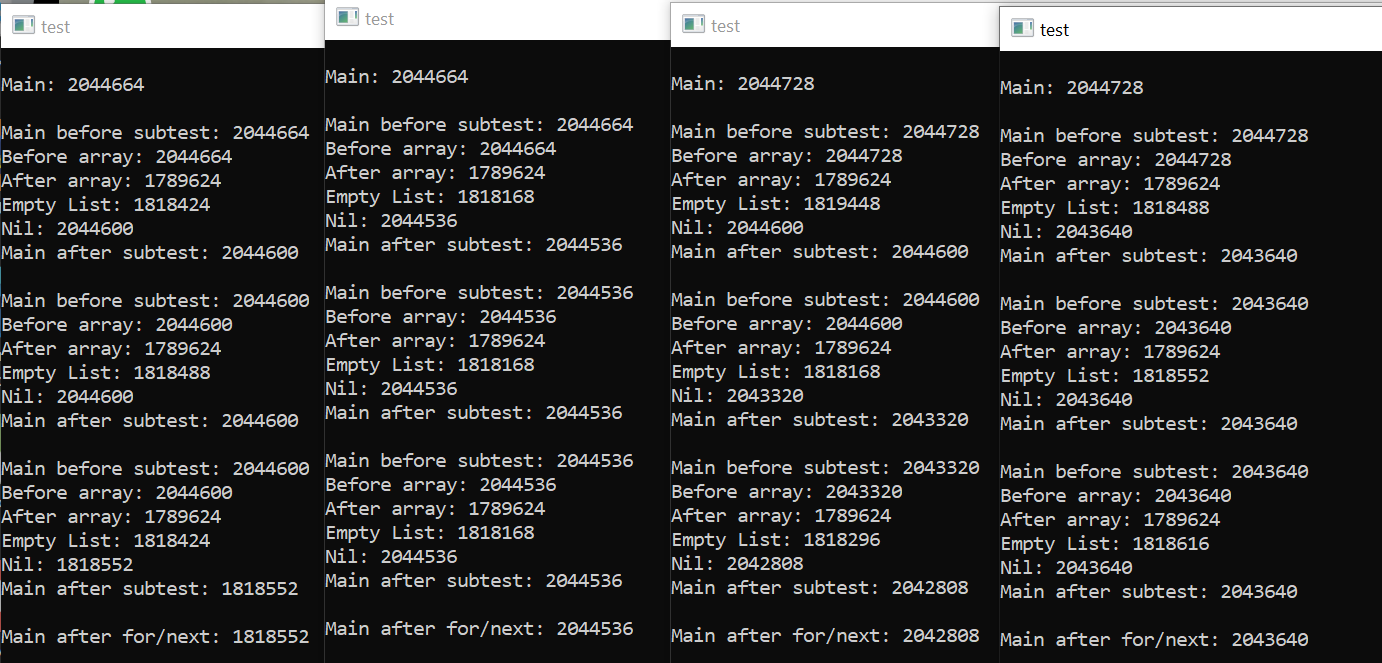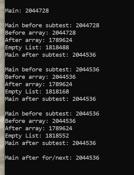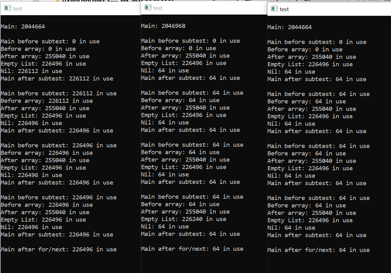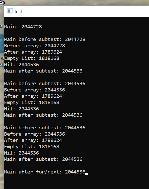 ? "Main after for/next: " + Ltrim( Str( Memory(MEM_TEST) ) )