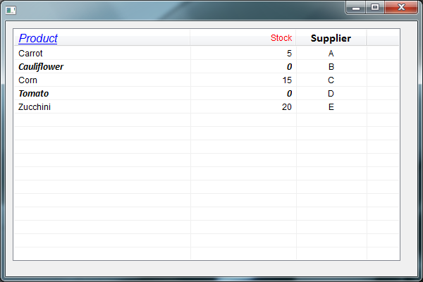 Só que as opções de cores (HeaderDYNAMICFORECOLOR e HeaderDYNAMICBACKCOLOR), ainda não sabemos por quê não funciona. Pode ser o compilador MiniGW ou pode ser o sistema operacional. Porque em XP as cores não são exibidas, eram pra serem exibidas as cores azul na primeira célula do Header e vermelho na segunda. Mas parece que em Win7 (eu não tenho aqui Win7) exibe HeaderDYNAMICFORECOLOR e não o HeaderDYNAMICBACKCOLOR.