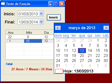 Em primeiro lugar quero agradecer aos colegas que me ajudaram a solucionar o meu problema em especial ao Pablo que fez este exemplo do código abaixo, mais agora estou necessitando de alterar um pouco esta rotina tirar os três TEXTBOX e alterar para dois TEXTBOX com a data inicial e data final e do lado um LABEL com o tempo convertido (ano,meses e dias) do período que o usuário digitou e outro LABEL para mostrar o total das entradas e depois inserir na GRID: