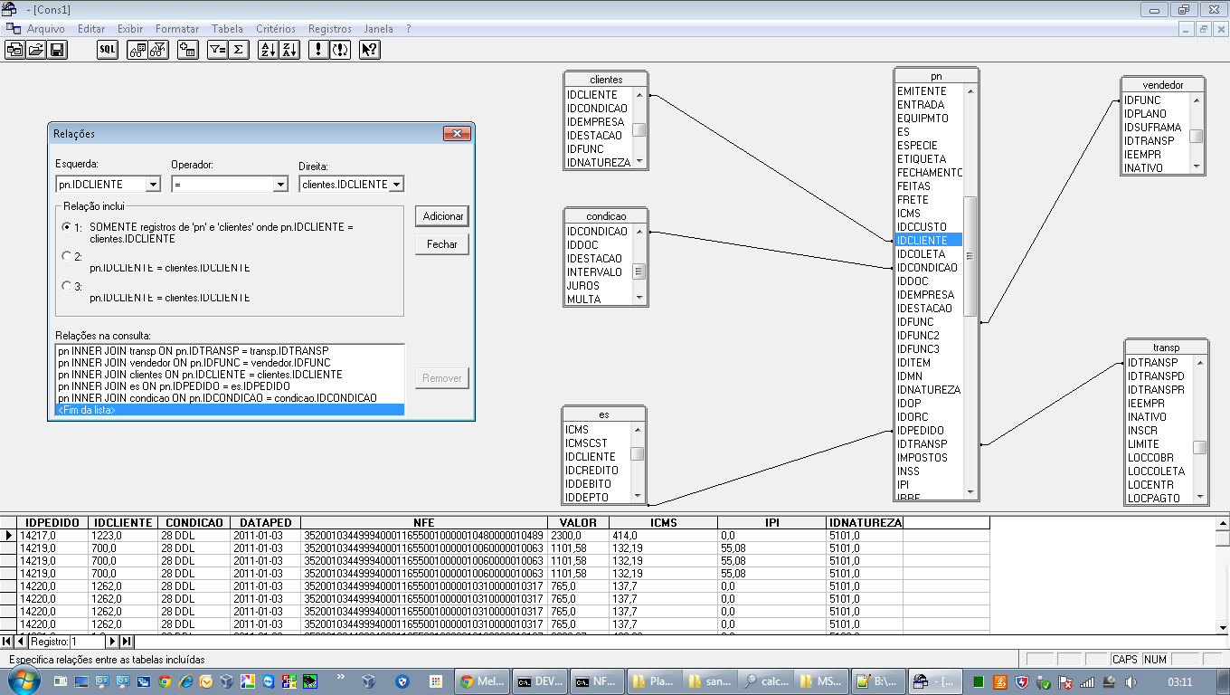 WHERE pn.IDTRANSP = transp.IDTRANSP AND pn.IDFUNC = vendedor.IDFUNC AND pn.IDCLIENTE = clientes.IDCLIENTE AND pn.IDPEDIDO = es.IDPEDIDO AND pn.IDCONDICAO = condicao.IDCONDICAOOPS! LINK QUEBRADO? Infelizmente links para www.pctoledo.COM.BR irão quebrar pois o Forum se foi, assim como nosso célebre Irmão de Bits Toledo. Ainda assim me ENVIE seu email com link do tópico encontrado na Web para [url=mailto://fivolution@hotmail.com]fivolution@hotmail.com[/url] e tentarei lembrar do que se tratava. Agradecido.