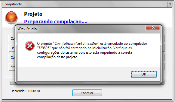 O projeto "[C:\caminho_do_projeto.xDev]" está vinculado ao compilador "729805" que não foi carregado na inicialização cerifique as configurações do sistema! Verifique as configurações do sistema pois isto está impedindo a correta compilação deste projeto.