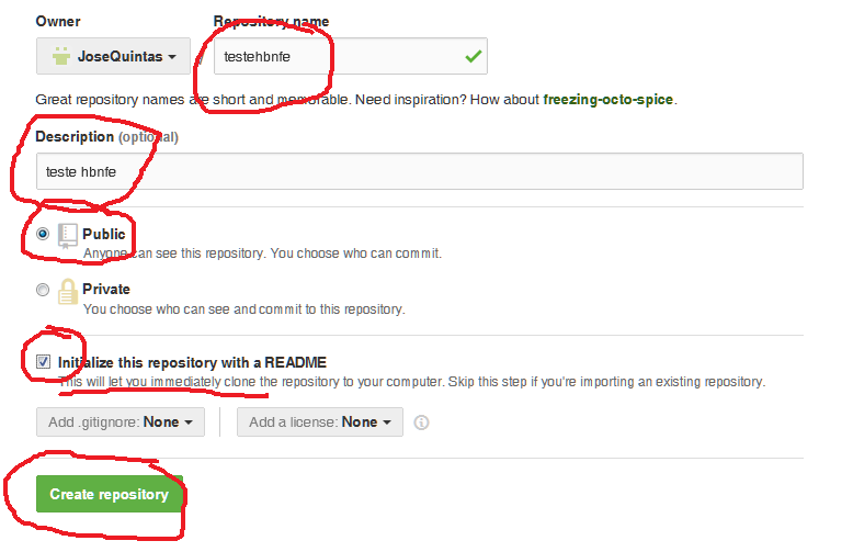 nome, descrição, se é público, e já mostra que se criar o readme já tem acesso instantâneo para o computador local.