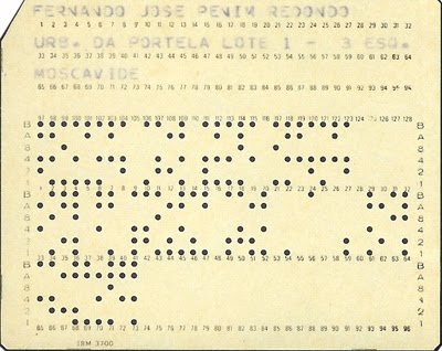Cartões perfurados de 80 e 96 colunas. Um cadastro de clientes, por exemplo, precisava ter 3 cartões para caber todos os dados e o programa tinha que controlar a existência e ordem dos 3 cartões. Naqueles tempos, um byte valia muito. Difícil imaginar hoje um cadastro de cliente com apenas 240 bytes...