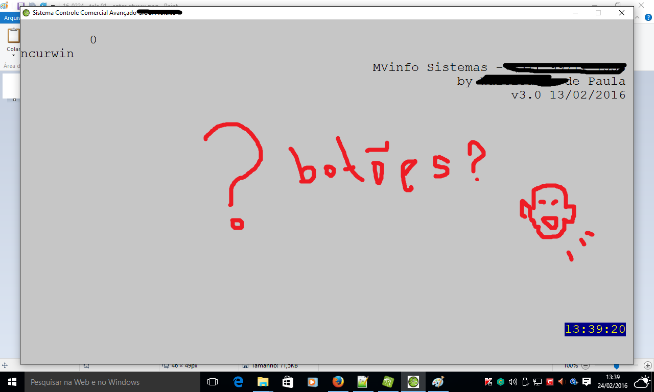 Aí peguei uma janela que já funcionava normalmente. Esta vejam: Aí - apenas para teste e se der certo, coloquei antes do código que faz essa tela (estilo msdos - console), um código que retirei da pasta \contrib\gtwvw\tests\DEMO.PRG e no lugar de aprsentar botões, combobox, e etc e tal, apareceu apenas os @say. Vejam, por favor: O código - adptado, já eliminei um montão de coisas pra ver se era algum erro, mas, não apresenta um simples botão. O código, separei por partes para melhor explicação.