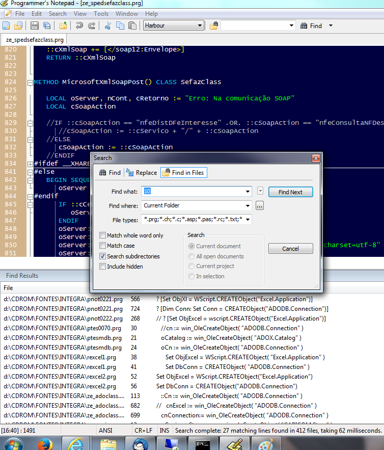 É Quintas esse do VB6 de mil anos atrás seria excelente para harbour. Quanto a editor, uso o TEXTPAD tem recursos interessantes como uso de macro, pesquisa como a que o José falou, clica no resultado já abre o PRG, transformar o texto em upper/lower, tem conjunto de comandos clipper52 que serve para harbour. Estou contente com ele.