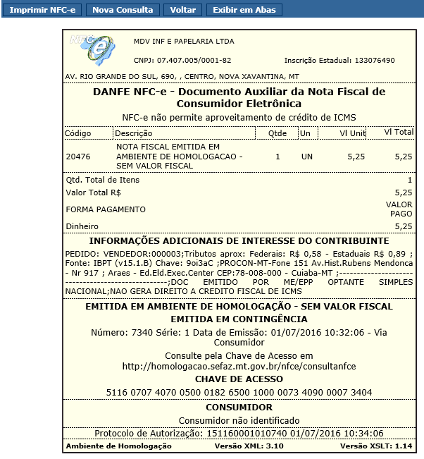 Vamos ver. Gerei o XML e imprimi o danfe para ver. Em homologação. Até aí tudo beleza. Apareceu a informação de 'Em contigência'.