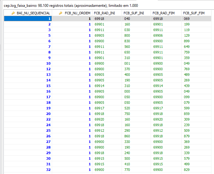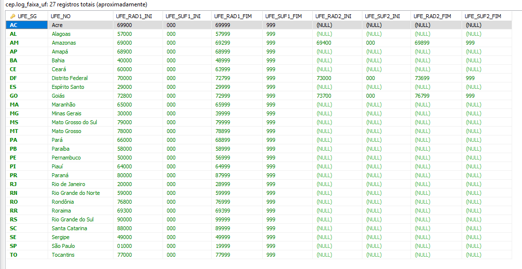 Cada UF, e faixas de CEP