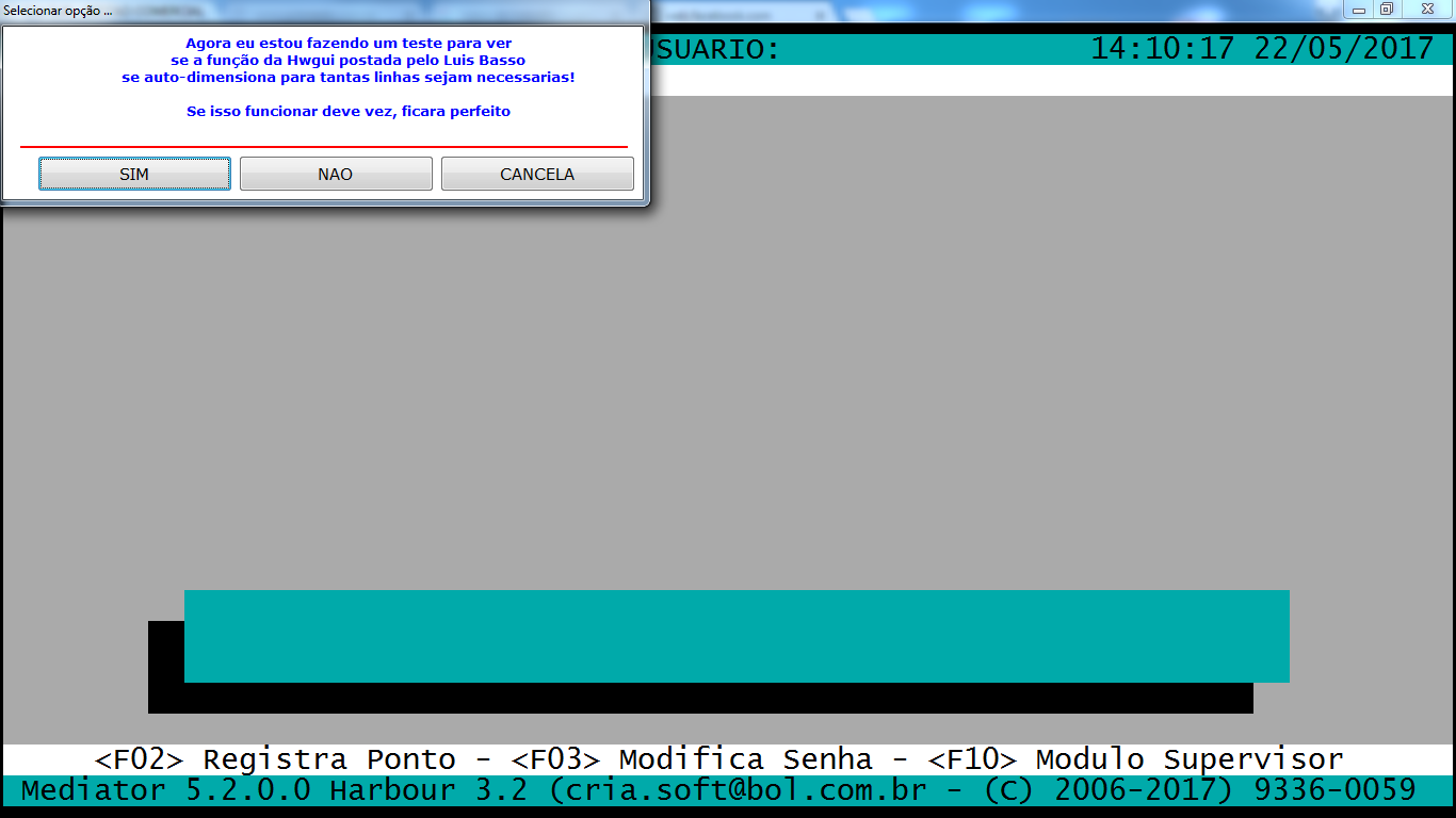 "Se isso funcionar deve vez, ficara perfeito", { "SIM", "NAO", "CANCELA" } )