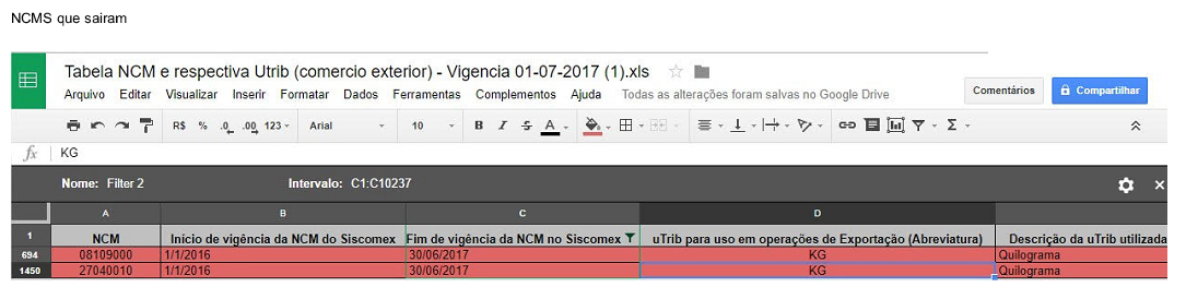 Na tabela divulgada dia 07/07/2017 faltava, por engano, 13 linhas correspondendo à faixa de NCMs 0811.1000 a 0814.0000 e deixou de ser informado que foram extintos os códigos 0810.9000, 2704.0010, 3206.1111, 3206.1119, 7304.5911, 7304.5919.