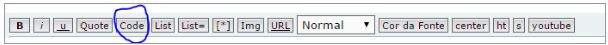 Para facilitar a análise de código fonte, o Fórum tem a "tag code" presente na barra de ferramentas da página que se abre para postar mensagens. Basta clicar no botão mostrado abaixo e colar o código entre as tags.