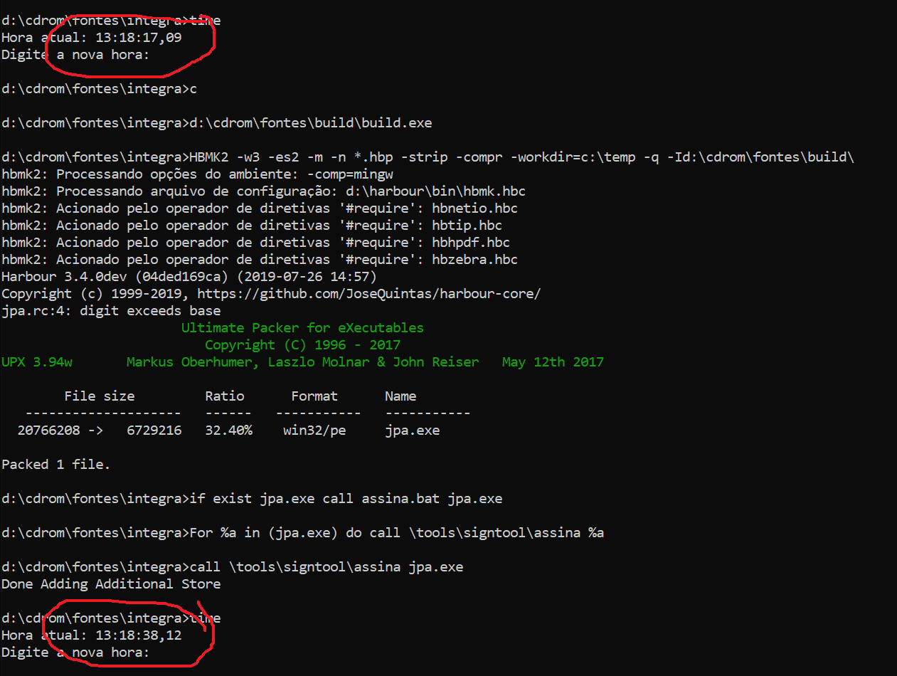 Como deu pra ver, está demorando 21 segundos com MINGW para o aplicativo que mais compilo, incluindo compactação e assinatura.