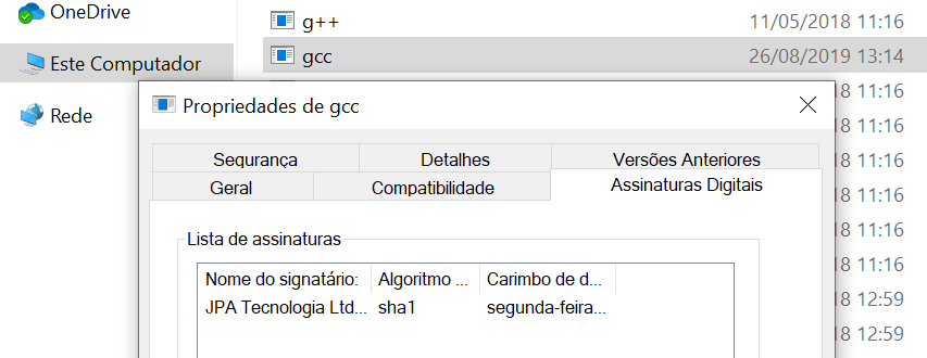 Coloquei a checagem no meu programa de build, e descobri que o gcc.exe não é assinado.