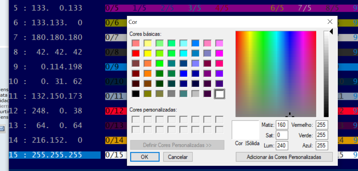 Mi deseo es generar una ventana donde aparezcan los colores y conseguir el valor decimal del color señalado. (algo parecido al que muestra Paint).