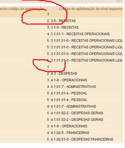 Código de aglutinação "Nível 1" usado somente para linha com o resultado do período (receitas-despesas)
