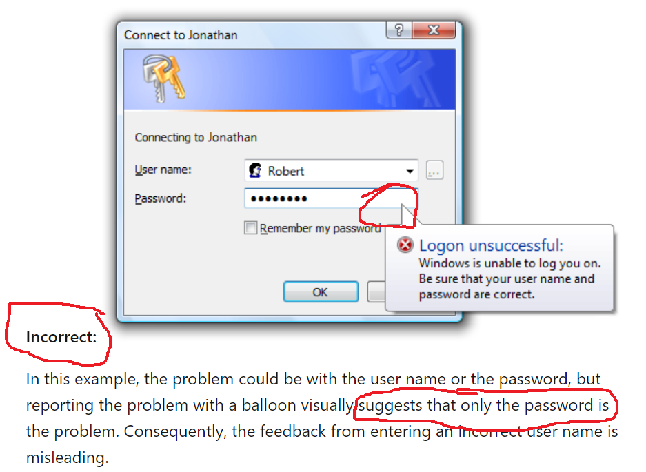 O balloon na senha sugestiona que o problema é somente a senha.