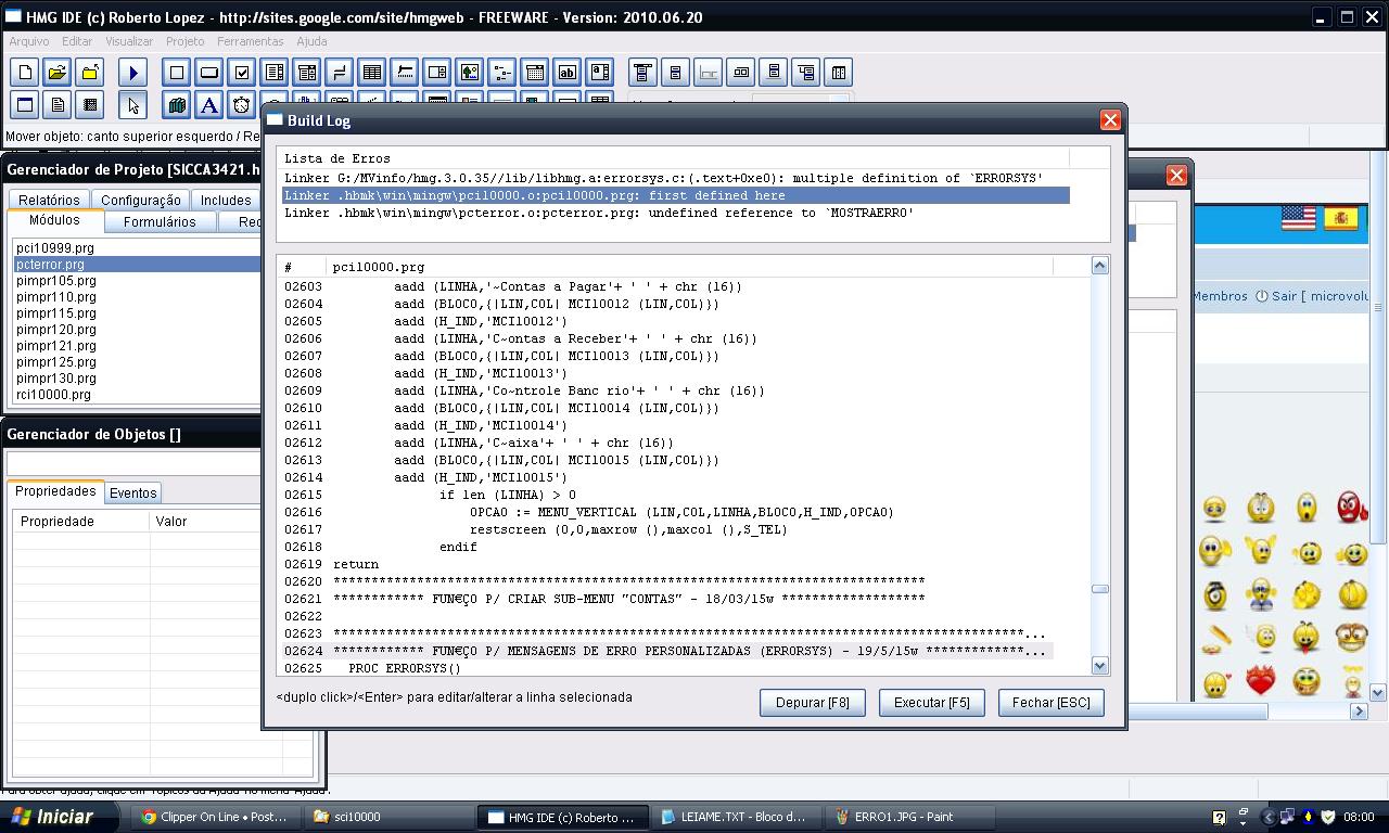 Amigo, na minha mensagem anterior eu não falei em retirar o arquivo PctError.prg do arquivo HBP, e sim retirar a lib libhmg.a da compilação, pois o ERRO1 está ocorrendo por causa do uso desta lib. E como disse, esta libhmg.a é uma lib para o modo gráfico da HMG, então pedi para você olhar se nos arquivos HBP ou HBC não tem uma chamada para esta lib, e se tiver, retirar a chamada desta libhmg.a.microvolution escreveu:se eu retirar do meu .HBP esse arquivo PCTerror.PRG a compilação com HMG 3.0.35 volta ao normal?
