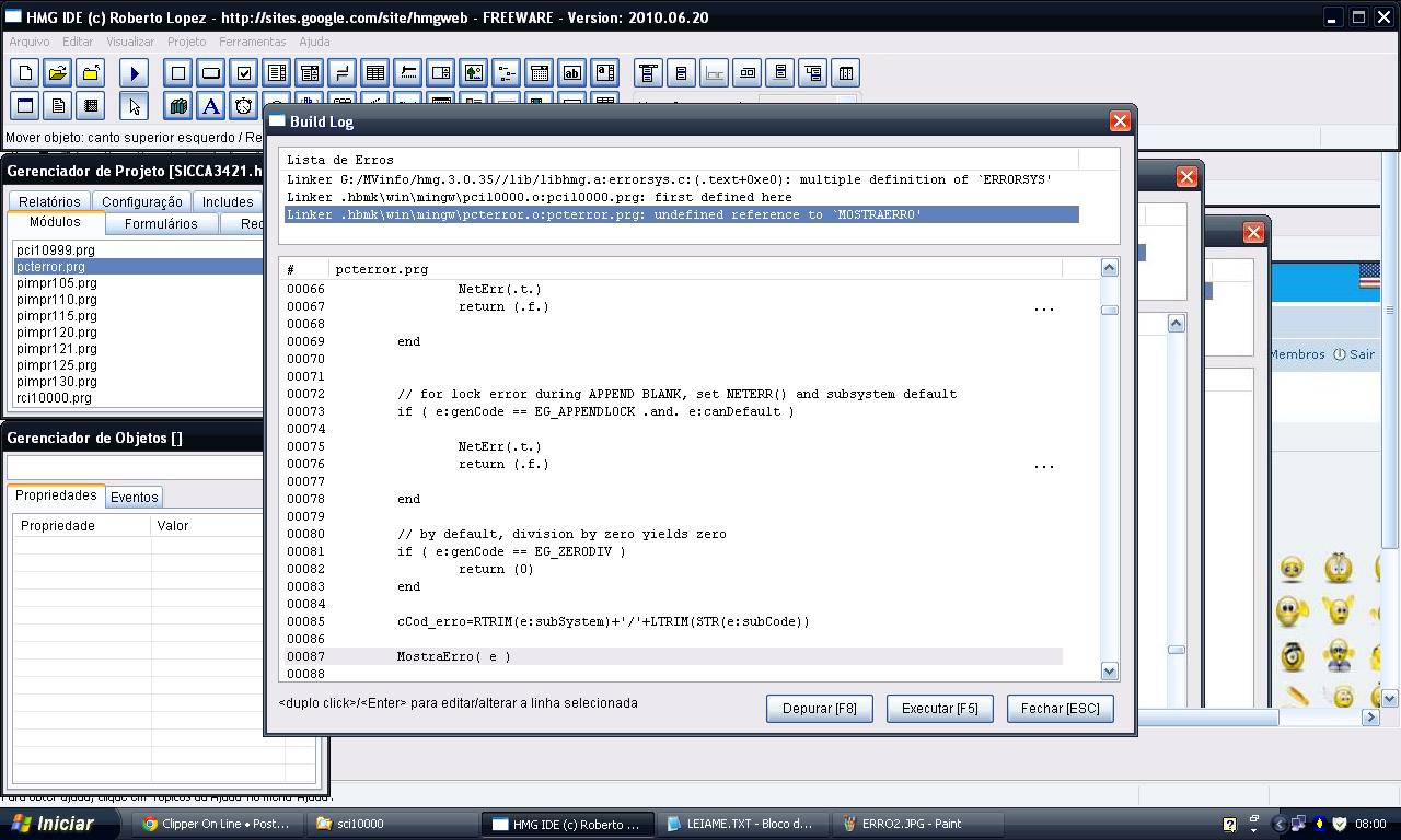 Editar o arquivo PctError.prg e alterar a linha 87, troque MostraErro( e ) por MostraError( e ).microvolution escreveu:ERRO3 - undefined reference to 'MOSTRAERRO'.