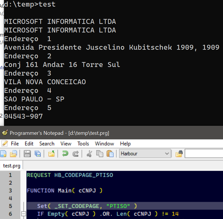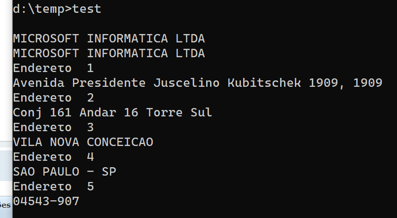 d:\temp>test                                                                                                                                                                                            MICROSOFT INFORMATICA LTDA                                                                          MICROSOFT INFORMATICA LTDA                                                                          Endereτo  1                                                                                         Avenida Presidente Juscelino Kubitschek 1909, 1909                                                  Endereτo  2                                                                                         Conj 161 Andar 16 Torre Sul                                                                         Endereτo  3                                                                                         VILA NOVA CONCEICAO                                                                                 Endereτo  4                                                                                         SAO PAULO - SP                                                                                      Endereτo  5                                                                                         04543-907