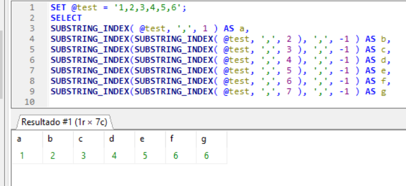 SET cText = CONCAT( cText, SUBSTR( A, nCont, 6 ), ',' );