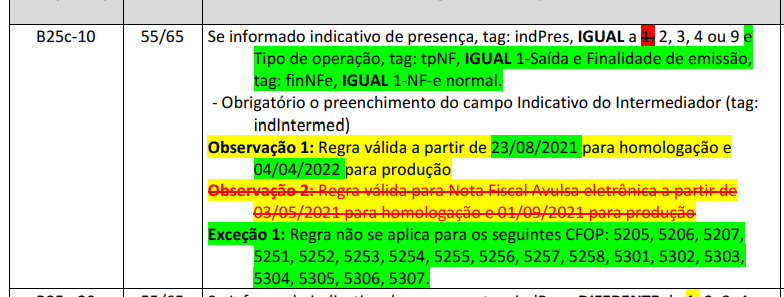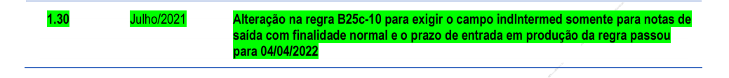 Alterada a regra B25c-10, retirando a obrigatoriedade de preenchimento do campo Indicativo do Intermediador (tag: indIntermed) quando indPres=1, para não ter um grande impacto na NF-e/NFC-e, tendo em vista o grande volume de operações presenciais sem intermediador.