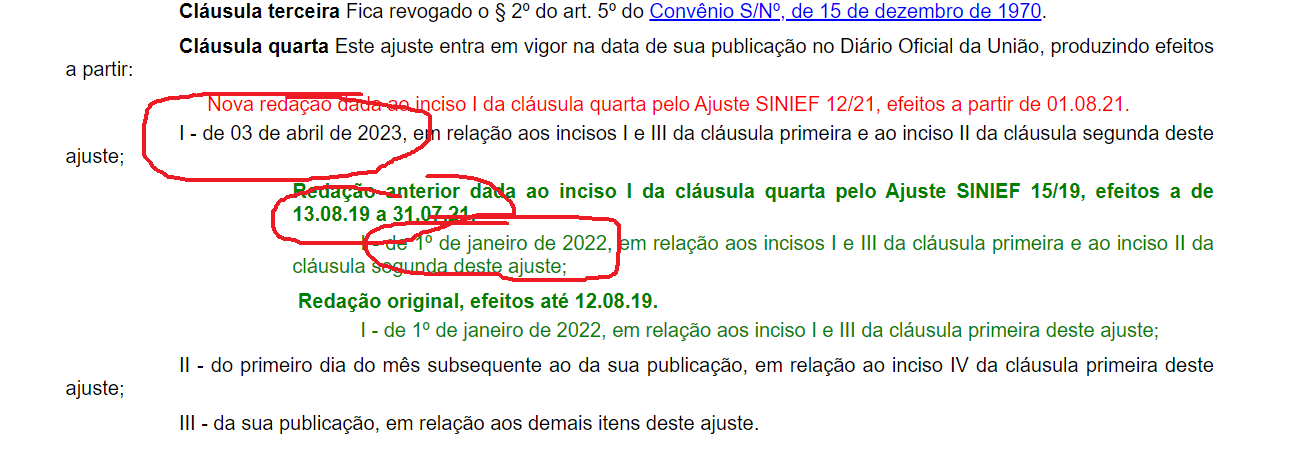 Incisos I e III da claúsula primeira, e no inciso II da cláusula II. Então veja a redação atual do inciso I da cláusula IV que determina o início da validade desse ajuste: