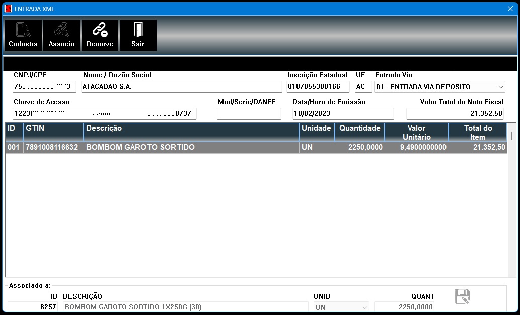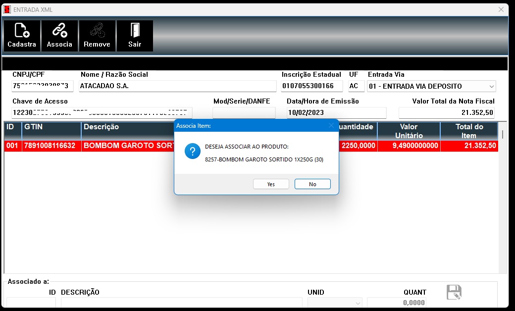 Aí uso um botão para associar o produto que chegou com o produto do meu estoque pelo código de barras