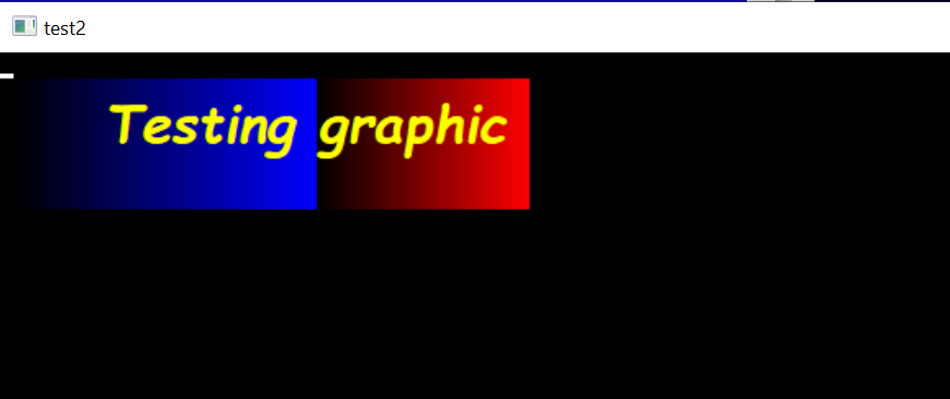 BT_DrawText( hDC, 0, 0, "Testing graphic", "Comic Sans MS", 18, YELLOW, BLACK, nTypeText, nAlignText )