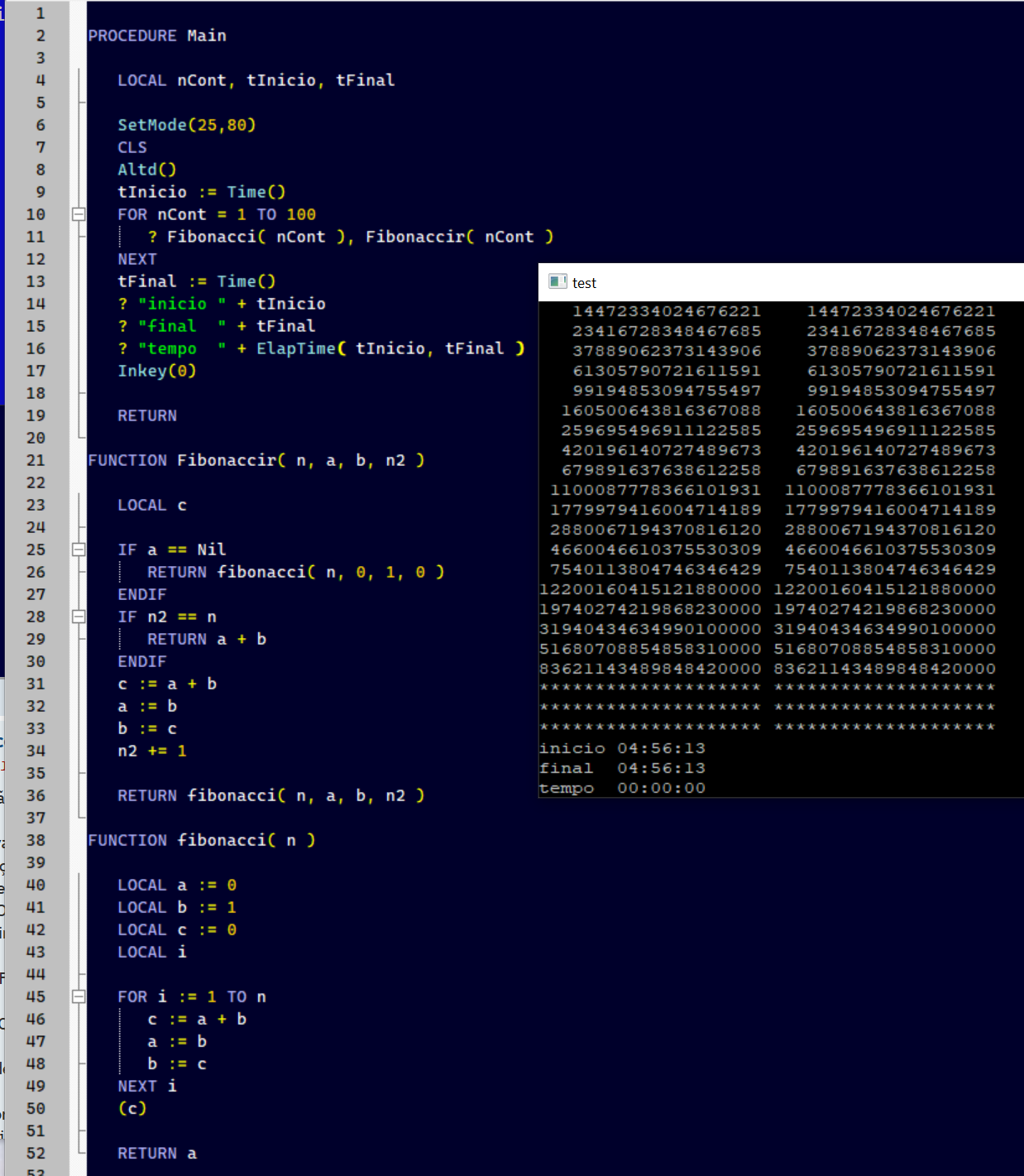 // ? "fibonacci(" + ALLTRIM(STR(i)) + ") = " + ALLTRIM(STR(nResultado))