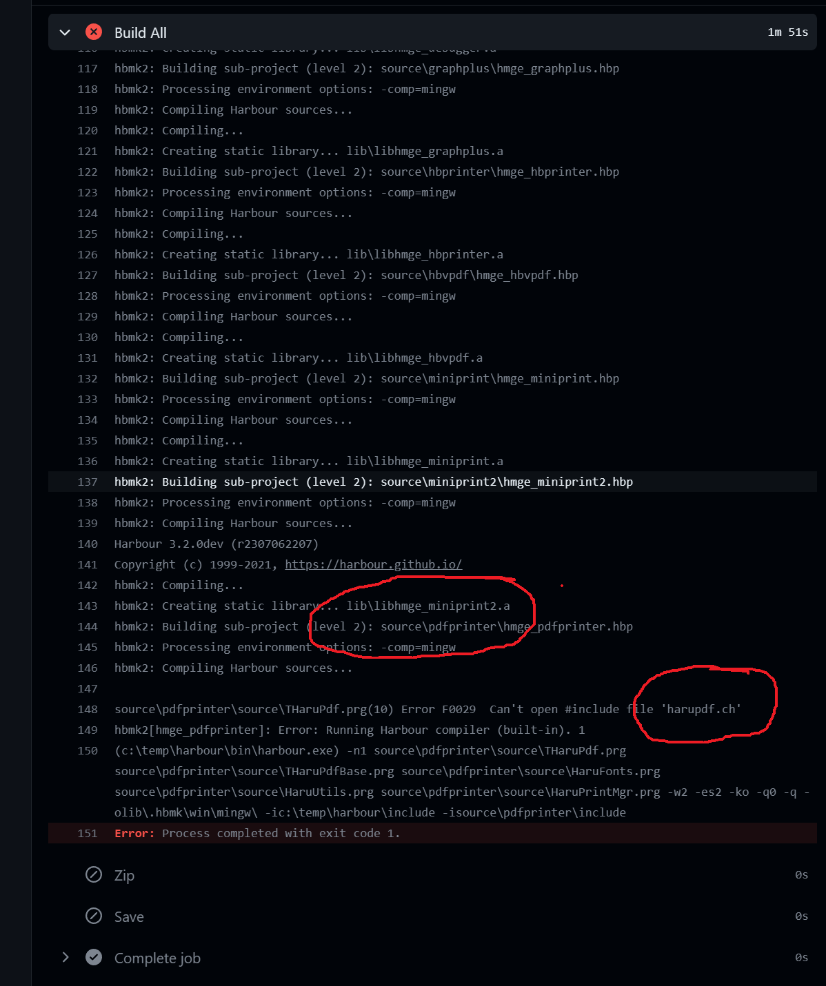 Como esse projeto é de LIB, deve estar faltando no HBP a indicação de harupdf.hbc, que é referente a lib dona desse ch.