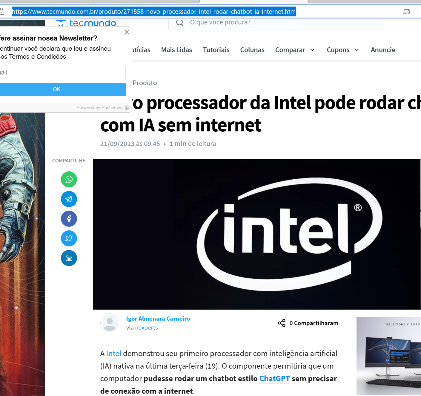 https://www.msn.com/pt-br/noticias/cien ... a301d&ei=9A Intel (NASDAQ:INTC) revelou que está lançando um novo chip programado para dezembro que terá a capacidade de executar chatbots de inteligência artificial generativa diretamente em laptops, eliminando a necessidade de recorrer a centros de dados em nuvem para o poder de processamento, conforme anunciado pela empresa na terça-feira (19).
