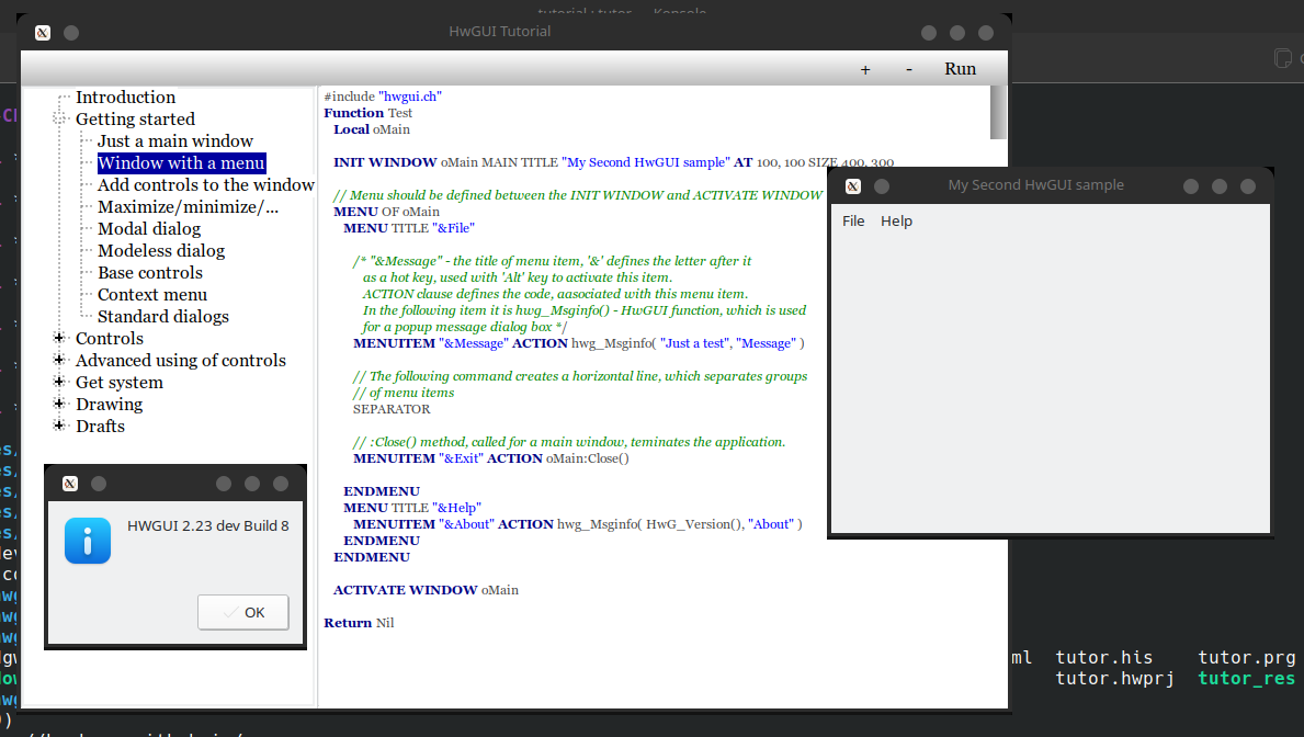 Se você compilou todos os fontes que vem com a lib, deve ter, na pasta "Tutor" da instalação padrão, o arquivo "Tutor.Exe". Execute e estude. Tem lá exemplos variados, inclusive de criação de menus. Execute cada exemplo com duplo clique no nome do exemplo que aparece do lado esquerdo da tela ou pelo botão RUN. O código fonte de cada exemplo aparece do lado direito da tela e pode ser alterado a qualquer momento. Após alterar este código fonte, basta clicar em RUN para ver o efeito da alteração.
