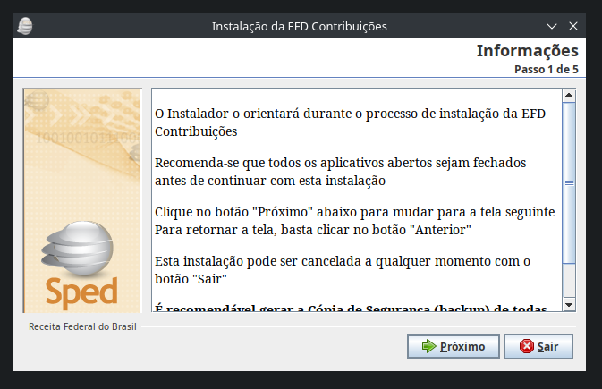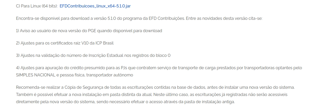 https://www.gov.br/receitafederal/pt-br ... ibuicoes-2 Colocar "c_h_m_o_d + x EFDContribuicoes_linux_x64-5.1.0.jar //Tornar executável!