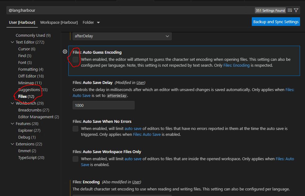 Depois, Tecle Ctrl + Shift + P para abrir o menu de configurações. Tecle "Preferences: Open Language Specific Settings. Selecione "Harbour". No menu que aparece no centro da tela, acesse a opção Files. No lado oposto da tela, desmarque a opção Auto Guess Encoding.