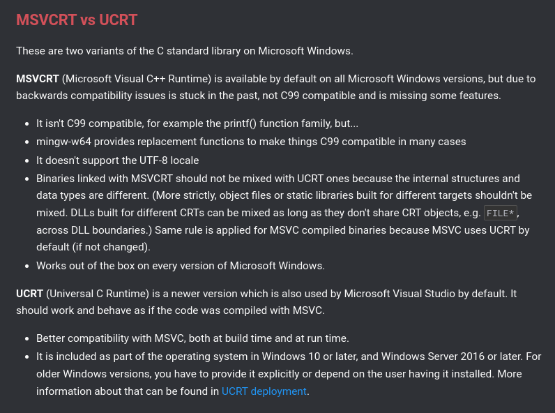 Veja que o GCC mais novo tem agora SUPORTE para as DLLs NATIVO DO WINDOWS. UCRT Já estou usando em produção. Estou passando a informação, não estou inventando da minha cabeça nada.