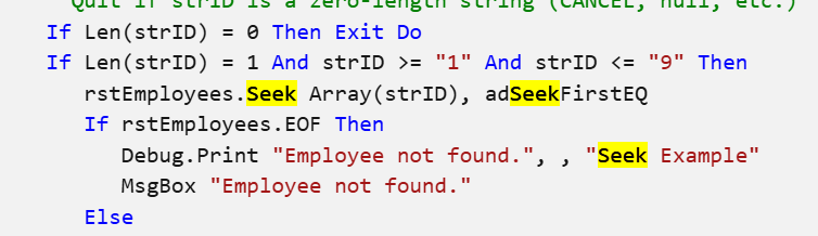 O ADO não tem seek, mas tem FIND, mas no seu caso acho que não vai usar somente pro primeiro