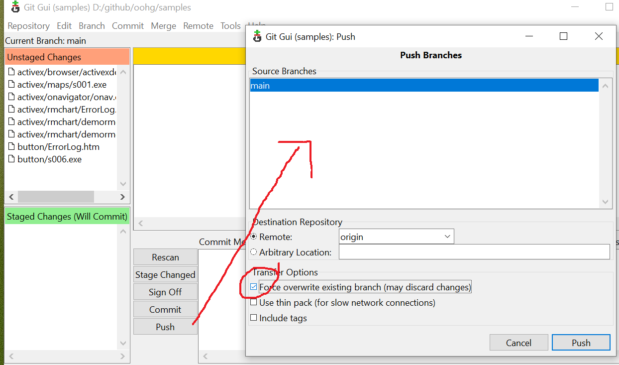 Preciso marcar esse "force overwrite existing branch(may discard changes)
