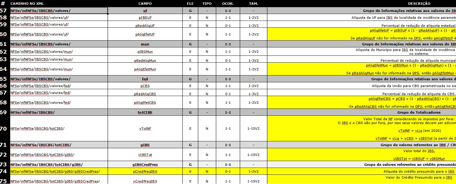 Segue o schema XSD por exemplo da NFSe: E o schema da NFCom que é nota de serviço de comunicação, que substitui o modelo 21 e 22. Os schemas XSD de todos os documentos vão ter os mesmos campos relacionados a CBS e IBS, então em "TODAS" as operações fiscais vai ter os 3.